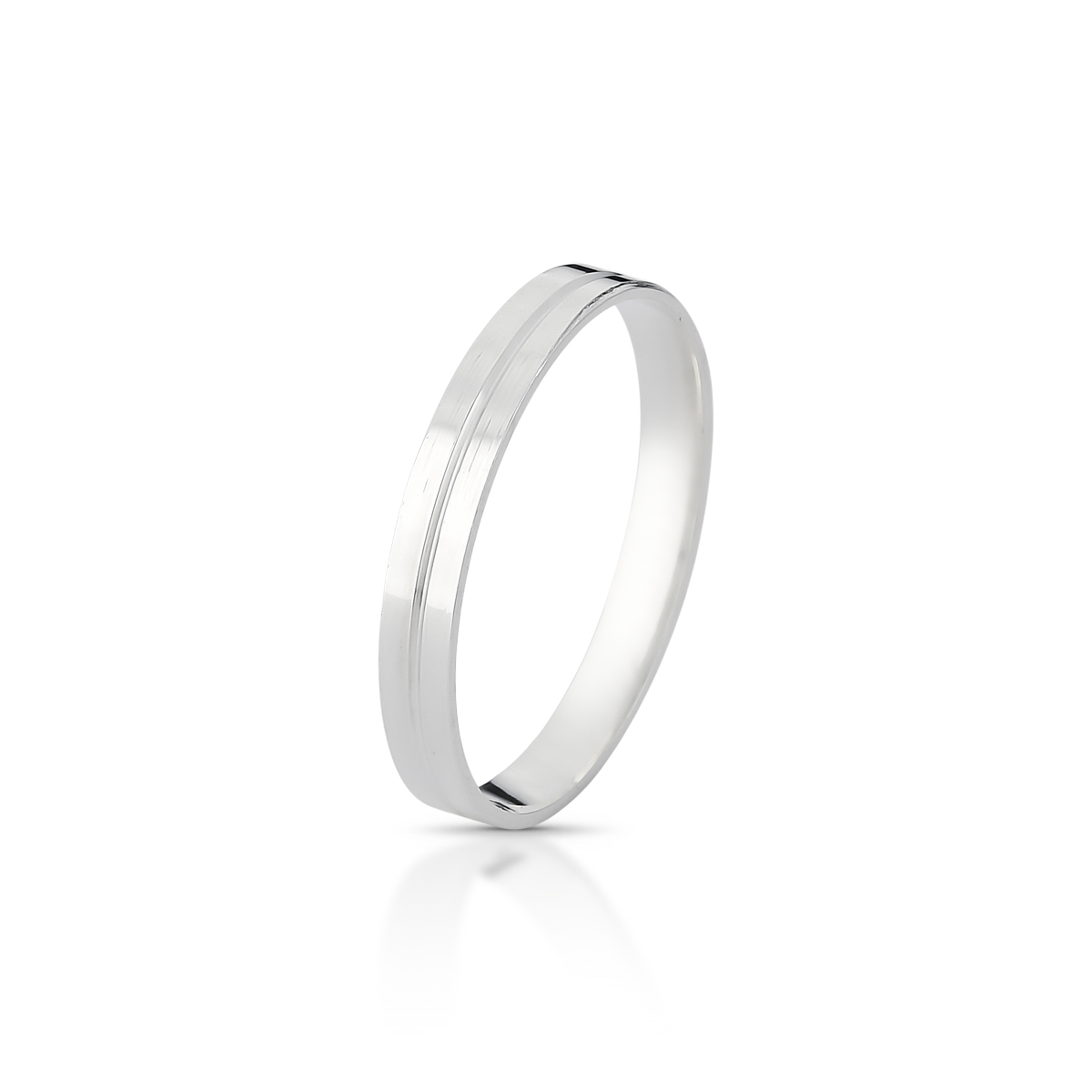 Aliança de prata. semi meia cana, reta na parte superior e com frisinho.